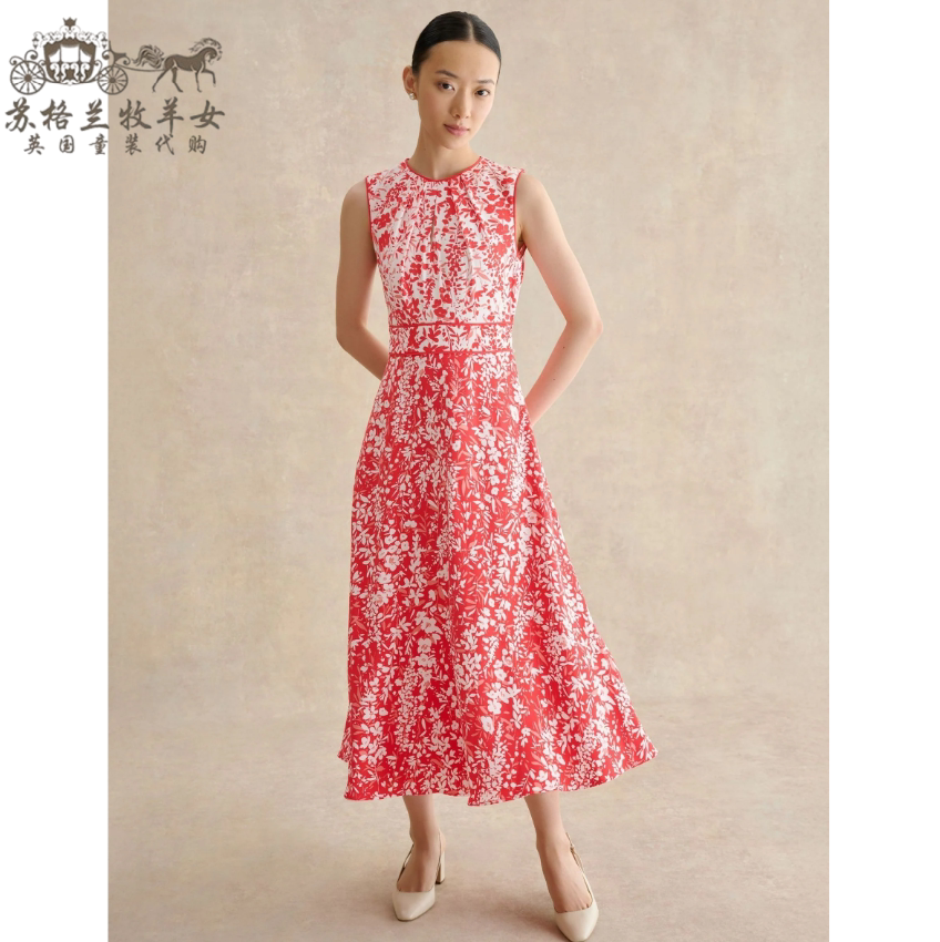 英国Hobbs代购 女装26春夏新款 红色碎花无袖 收腰中长裙连衣裙子