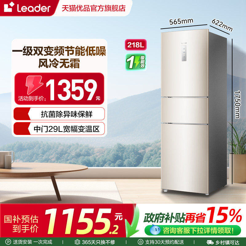 【补贴15%】海尔冰箱226L升大容量三门一级双变频风冷家用电冰箱