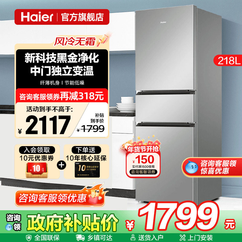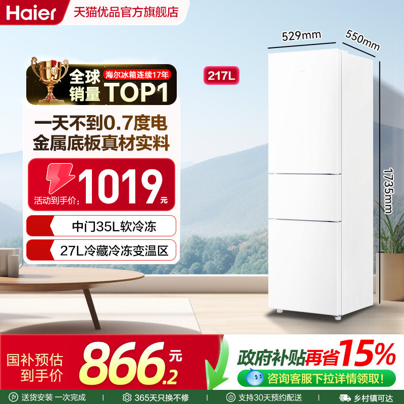 海尔电冰箱以旧换新补贴三门217L出租房二人家用小型宿舍官方旗舰