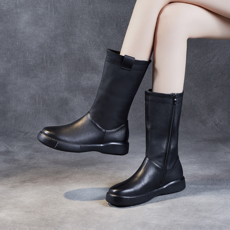 真皮平底中筒靴舒适软底女靴新款秋冬季马丁靴加绒保暖牛皮妈妈鞋
