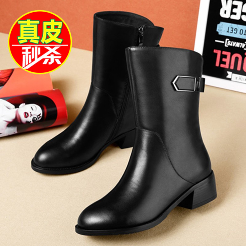 全牛皮高筒靴冬季新款骑士靴真皮中长靴子女中筒靴平底内增高靴子