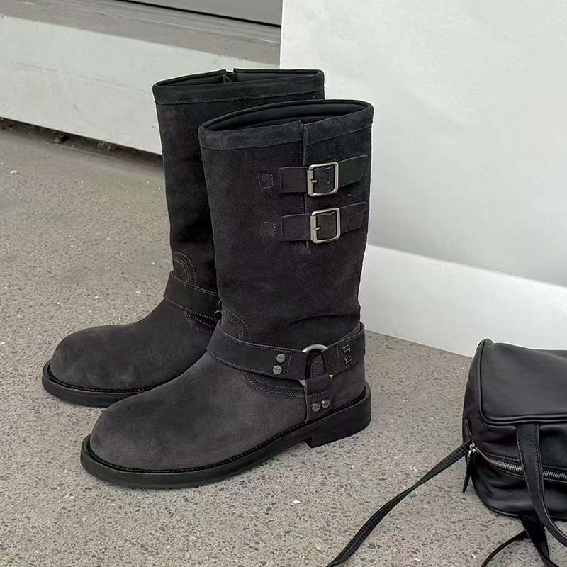 欧洲站2025秋季新款欧货真皮女靴低跟平底皮带扣磨砂皮时装中筒靴
