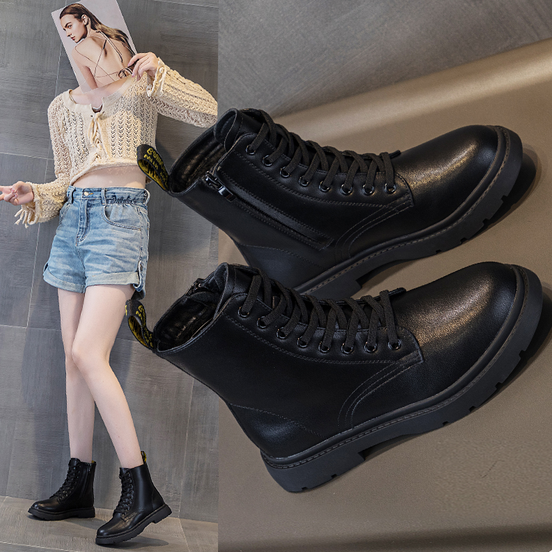 纯皮马丁靴女英伦风短靴真皮圆头绑带机车靴平底靴百搭软底中筒靴