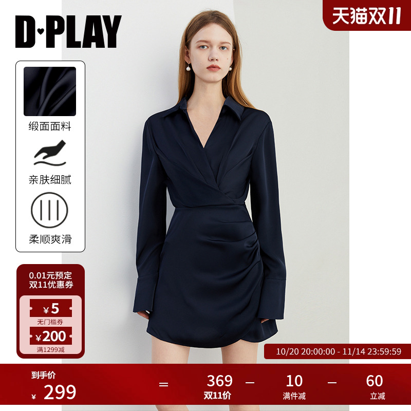 DPLAY2025秋季新款藏青色长袖衬衫连衣裙气质收腰流行缎面裙子女