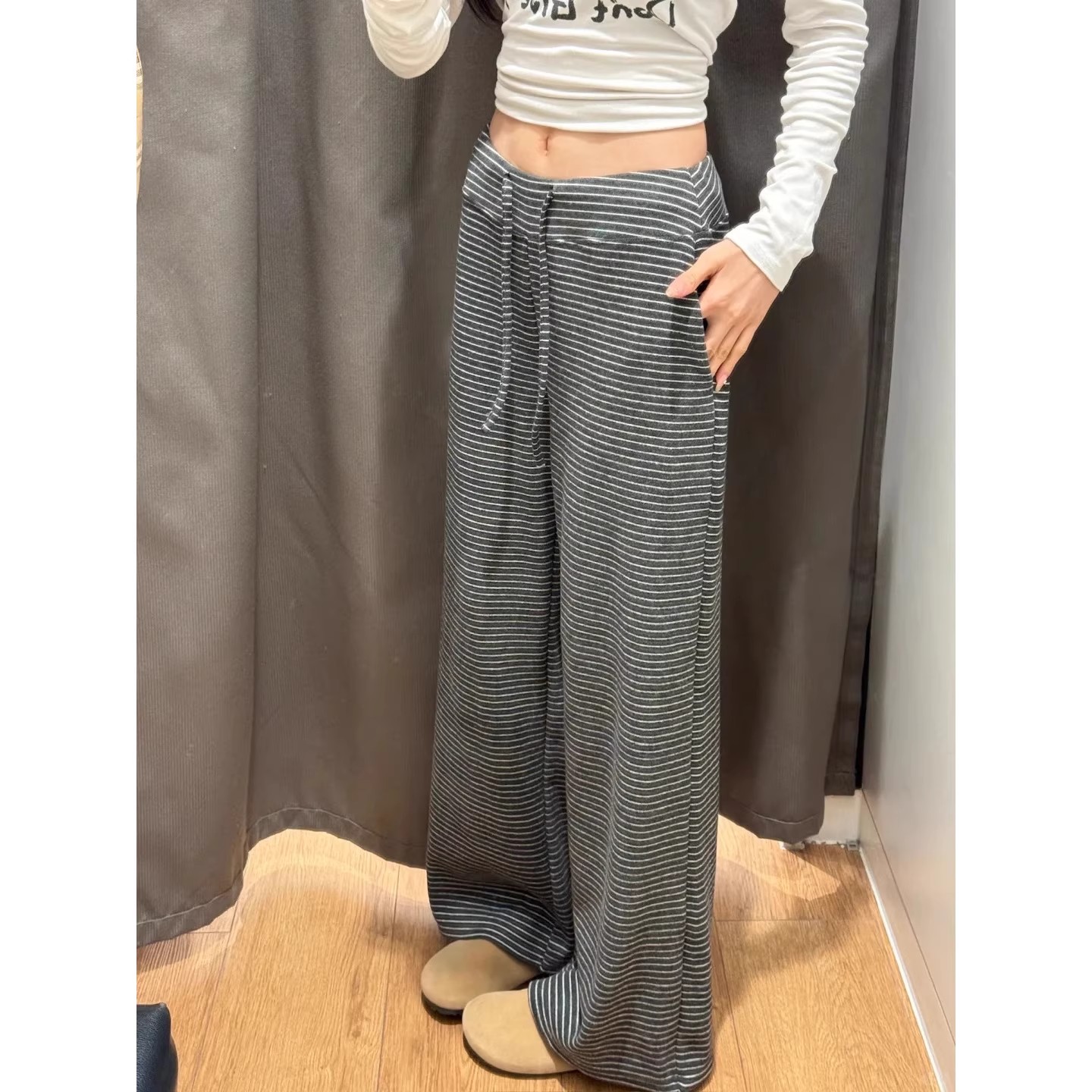 罄米单/两件装 糯米黑色条纹裤女2025春秋松紧腰抽绳直筒裤长裤女