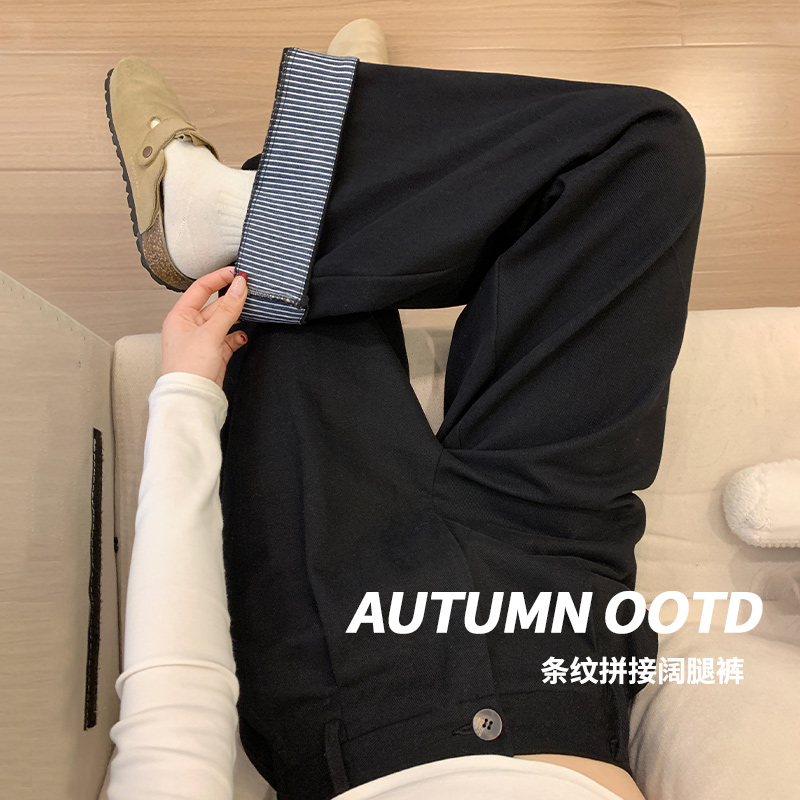 黑色翻边条纹阔腿裤女春秋2025新款秋冬高腰宽松休闲百搭直筒裤子