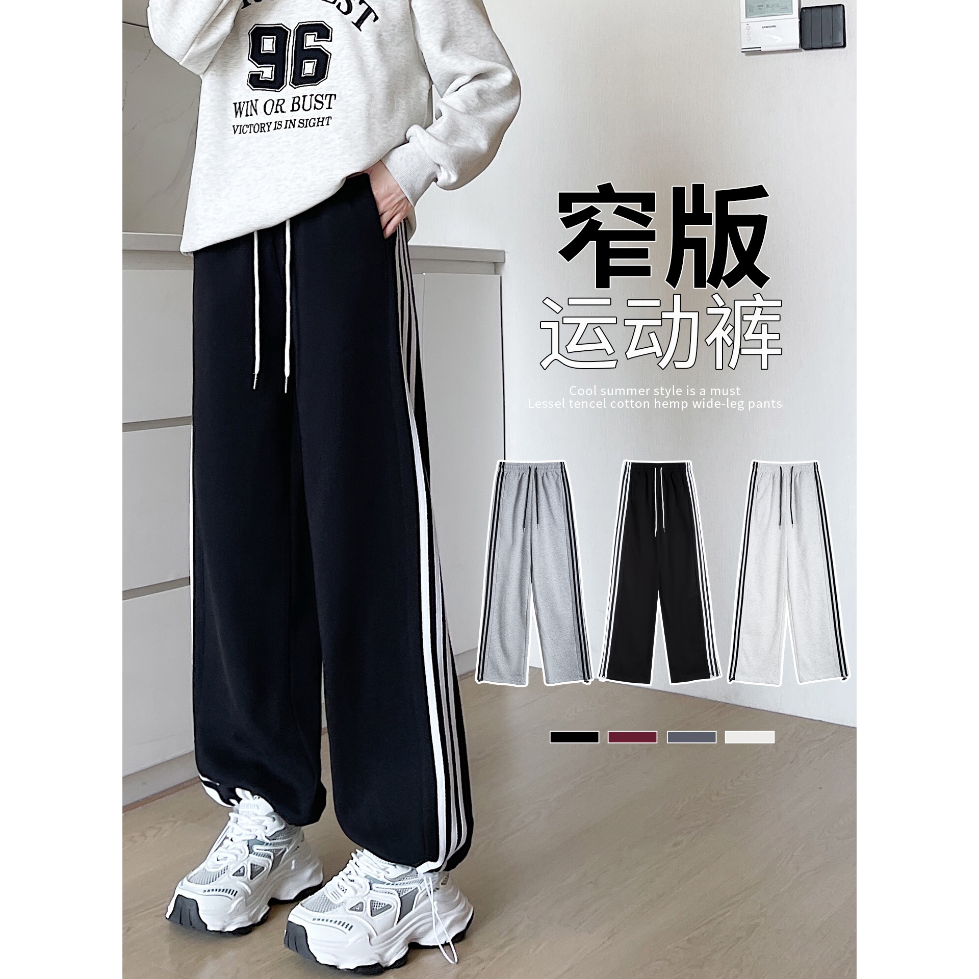 大码黑色条纹运动裤女春秋新款高腰阔腿裤小个子休闲宽松直筒卫裤