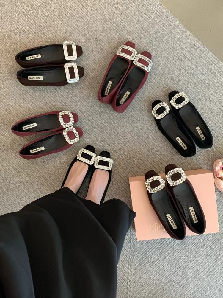 米霏~方头浅口单鞋女冬平底2025新款方扣水钻配裙子瓢鞋大码女鞋