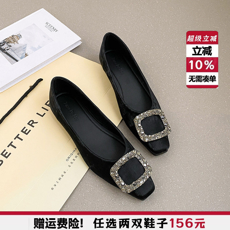 方头浅口单鞋女平底2025年新款春季鞋子法式气质水钻方扣黑色瓢鞋