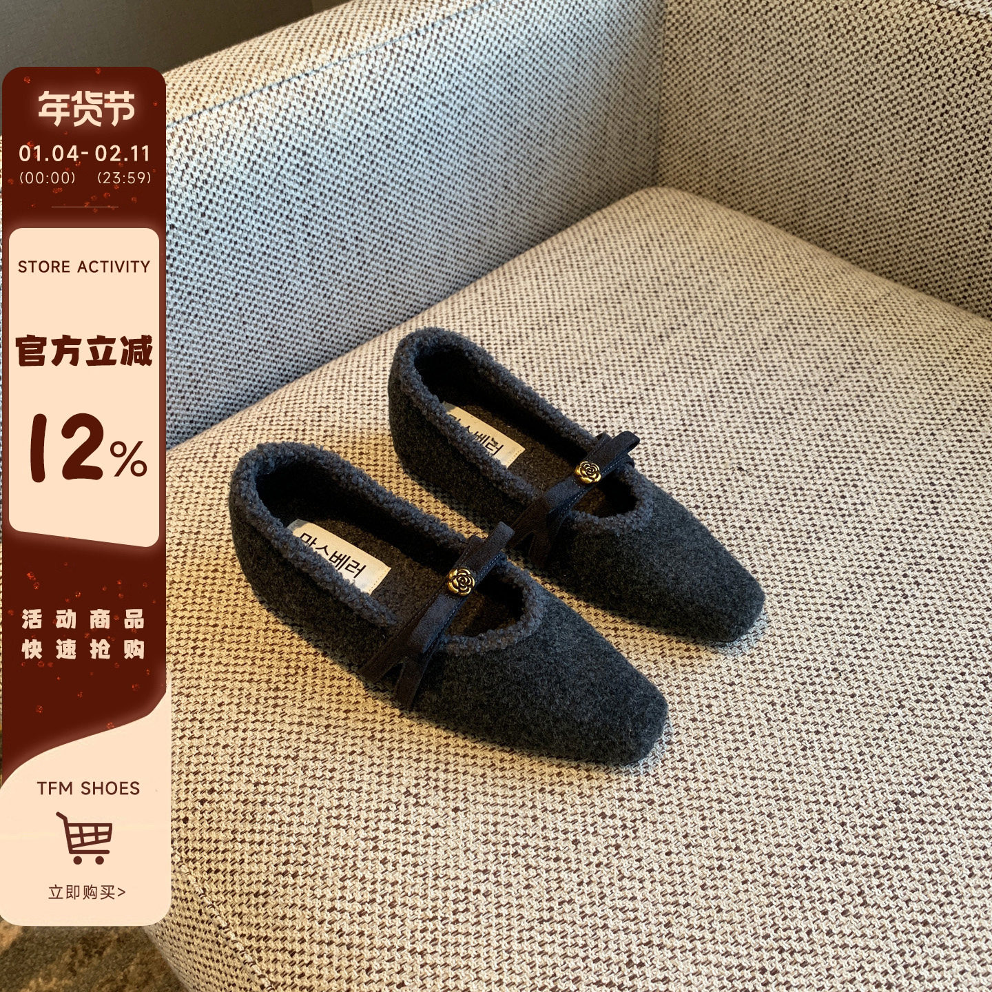 【TFM】内增高3CM~小香风一字带蝴蝶结毛呢玛丽珍浅口单鞋女平底