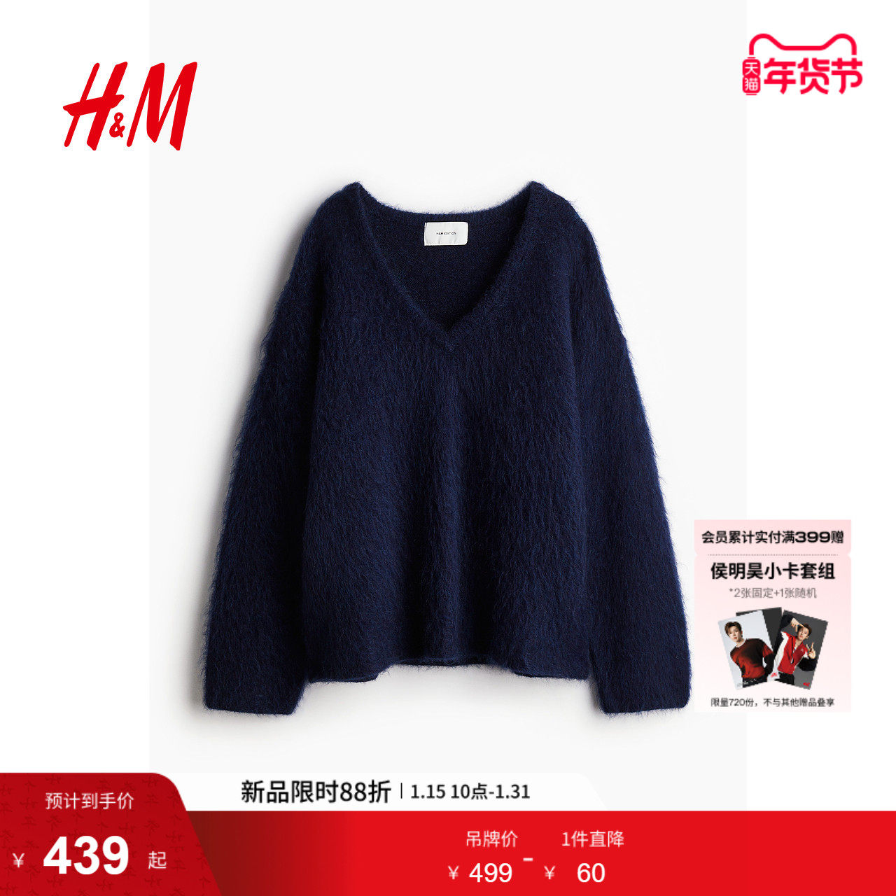 HM女装毛针织衫冬季大廓形V领马海毛羊毛混纺长袖毛衣套衫1248344