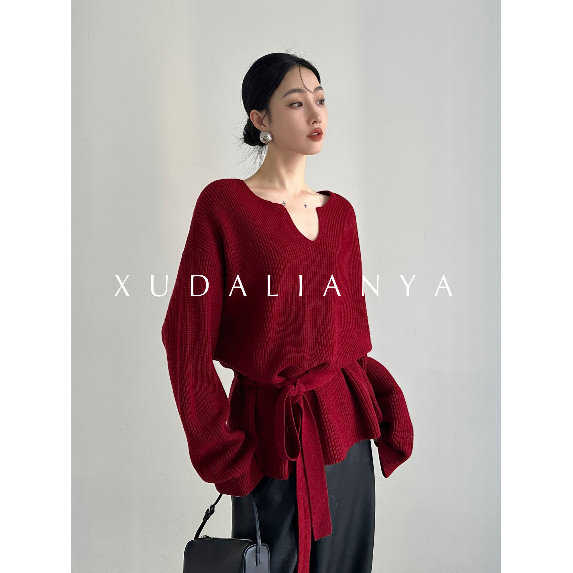 法式设计感v领亮丝大蝴蝶结套头针织衫秋冬新款时尚宽松洋气毛衣