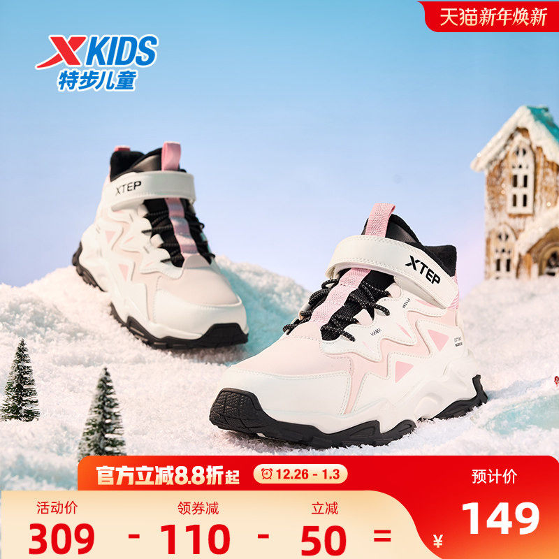特步儿童冬季新款中大童鞋女童冬鞋二棉鞋加绒棉鞋儿童高帮休闲鞋