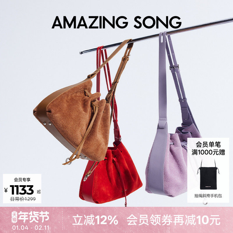 【明星同款】Amazing Song乙颂甜甜圈抽绳桶包头层麂皮单肩斜挎包