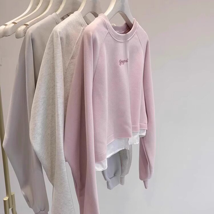 明线圆领套头卫衣女蜜桃粉长袖纯色百搭高腰短款小个子外套上衣潮