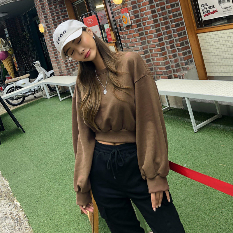 显身材。复古高腰AA短款米尼绒圆领套头卫衣女宽松百搭休闲上衣春