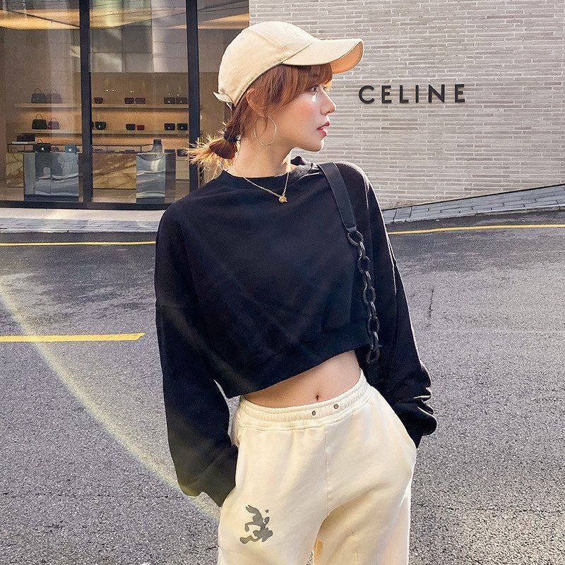 Micn~黑色短款高腰卫衣女ins新款百搭露脐套头罩衫长袖宽松上衣潮