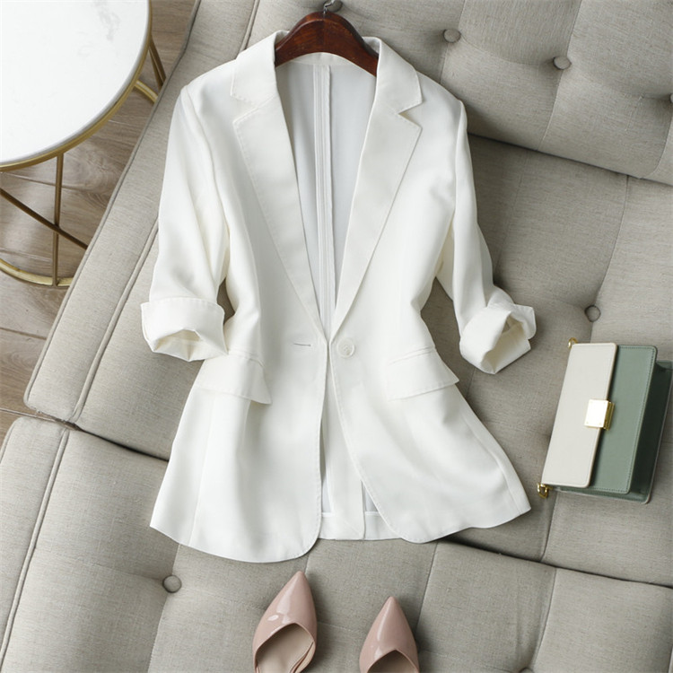 简约有档次的美!垂感抗皱七分袖中长款通勤休闲白色西装外套女薄