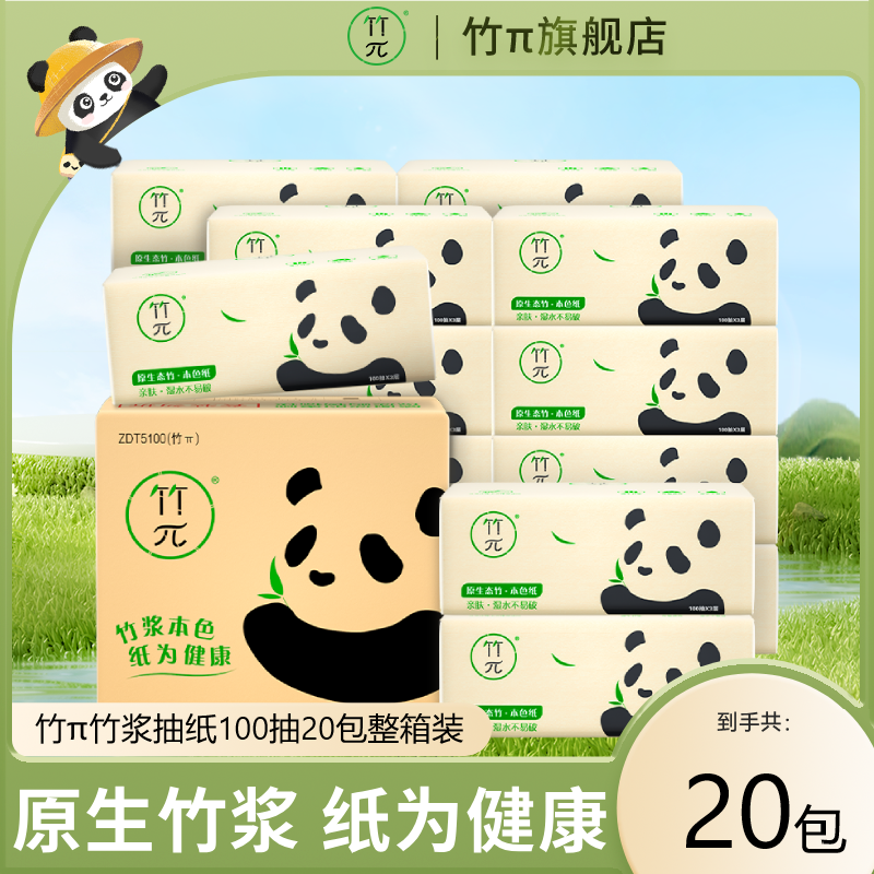 竹π抽纸餐巾竹浆纸本色纸面巾纸实惠装100抽20包擦手卫生纸巾