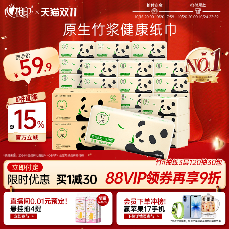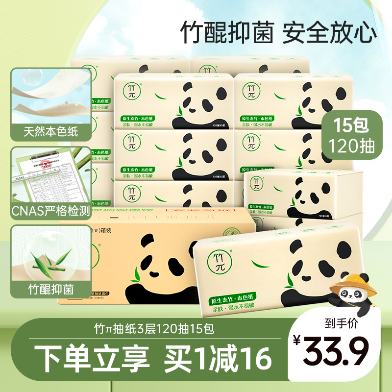 心相印竹π抽纸120抽15包本色竹浆卫生纸巾餐巾纸家用实惠装整箱