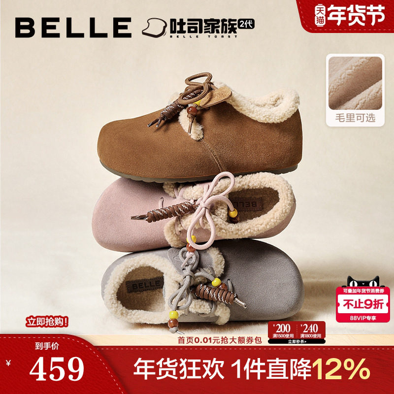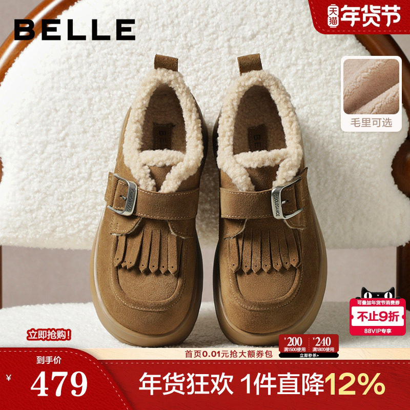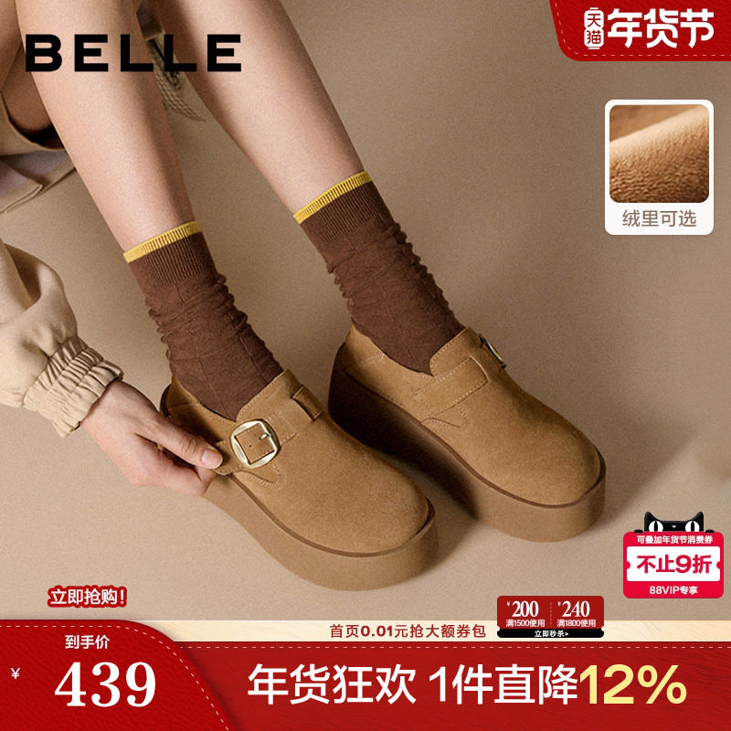 百丽千层可颂厚底增高勃肯鞋冬季加绒乐福毛毛单鞋雪地靴E4S1DC预
