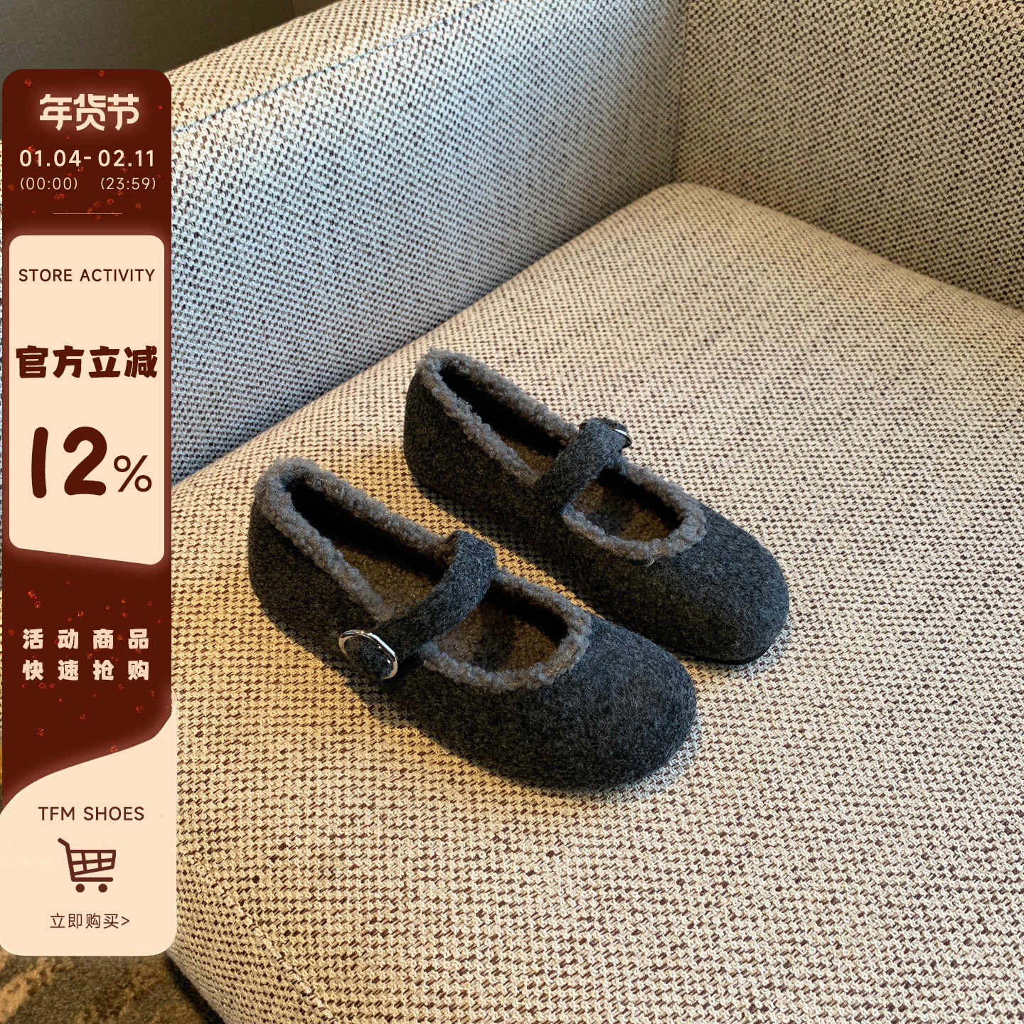 【TFM】复古毛绒玛丽珍鞋女内增高一字扣毛毛单鞋平底加绒棉鞋子