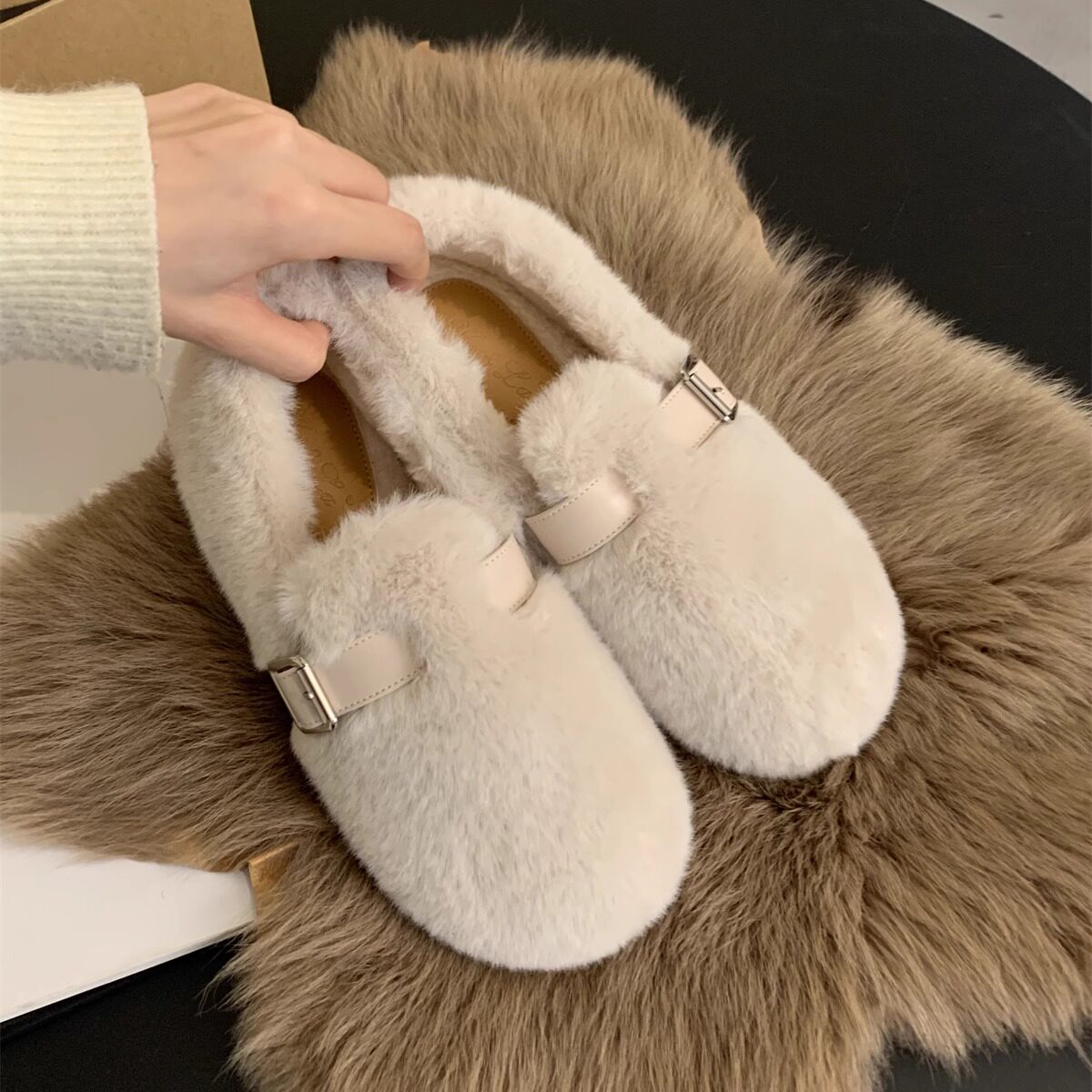 兔毛版~加绒皮面勃肯鞋女2025冬季新款皮带扣毛毛单鞋毛绒小皮鞋