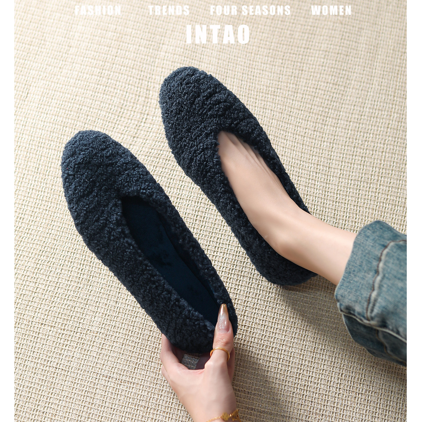 杏色浅口平底加绒芭蕾舞棉鞋女外穿2025秋冬新款法式圆头毛毛单鞋