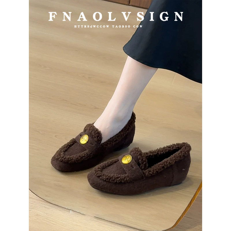 羊皮版~复古加绒乐福鞋女一脚蹬英伦风金币保暖毛毛单鞋冬季棉鞋