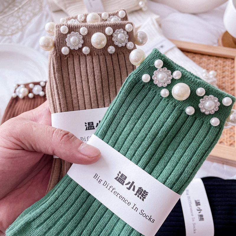 韩版时尚水钻太阳花珍珠袜子女中筒袜春秋堆堆袜女搭配小皮鞋个性