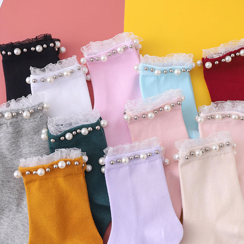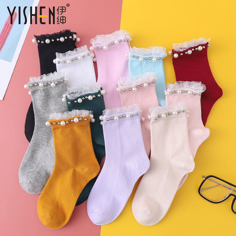 花边珍珠袜子女中筒袜ins潮春秋季棉袜蕾丝纯色短袜百搭女士长袜