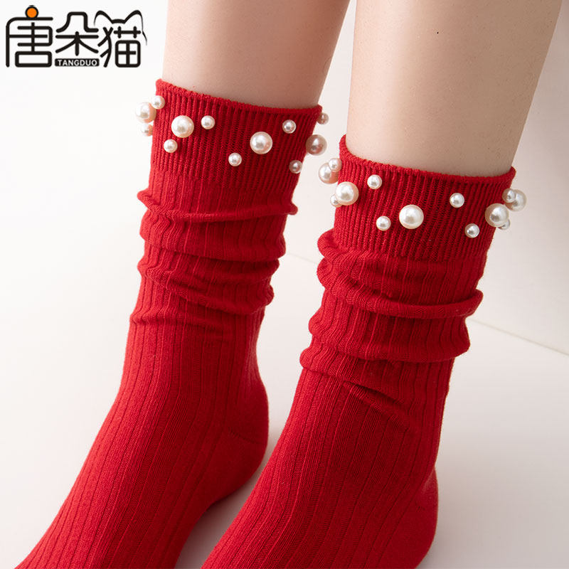 马年时尚珍珠袜子女大红色ins潮流外穿网红堆堆中筒袜过年本命年