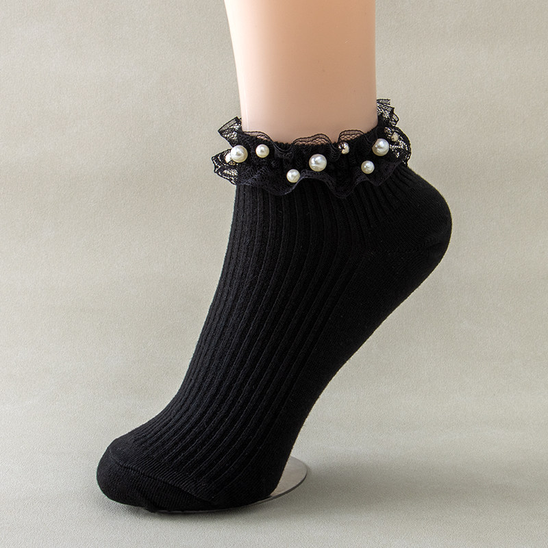 袜子女ins潮蕾丝边黑白色日系可爱花边珍珠袜子女个性春短袜钉珠