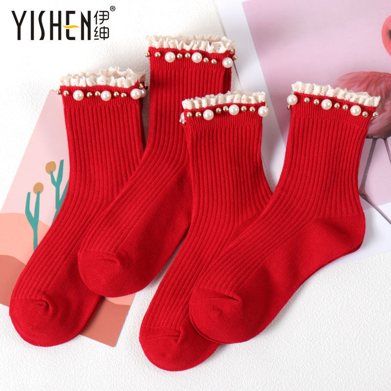 伊绅花边红色袜子女本命年可爱日系棉袜秋冬季兔年转运韩版珍珠袜