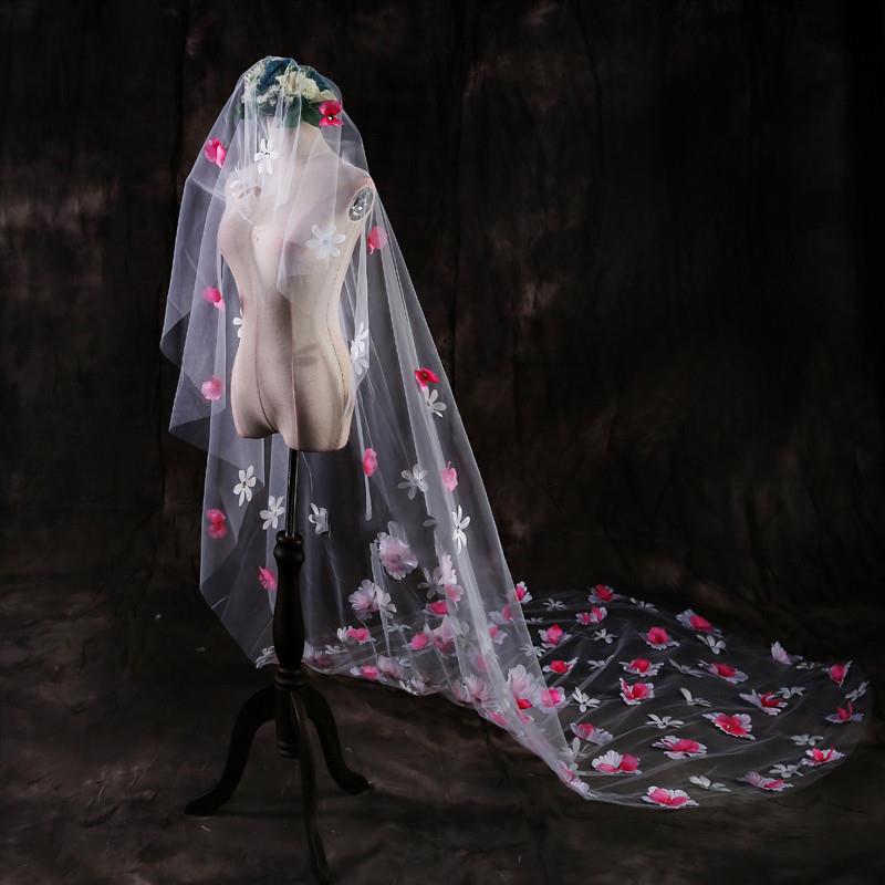高端奢华旅拍轻婚纱长头纱法式蕾丝花朵头纱超仙森系造型拖尾头纱