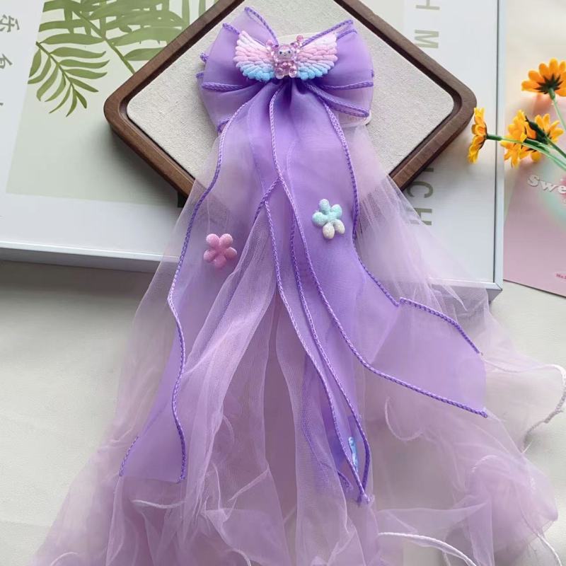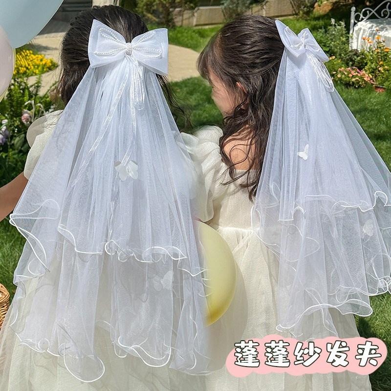 儿童发夹披纱蝴蝶结长头纱发饰花童飘纱顶夹子女孩公主网纱发夹子