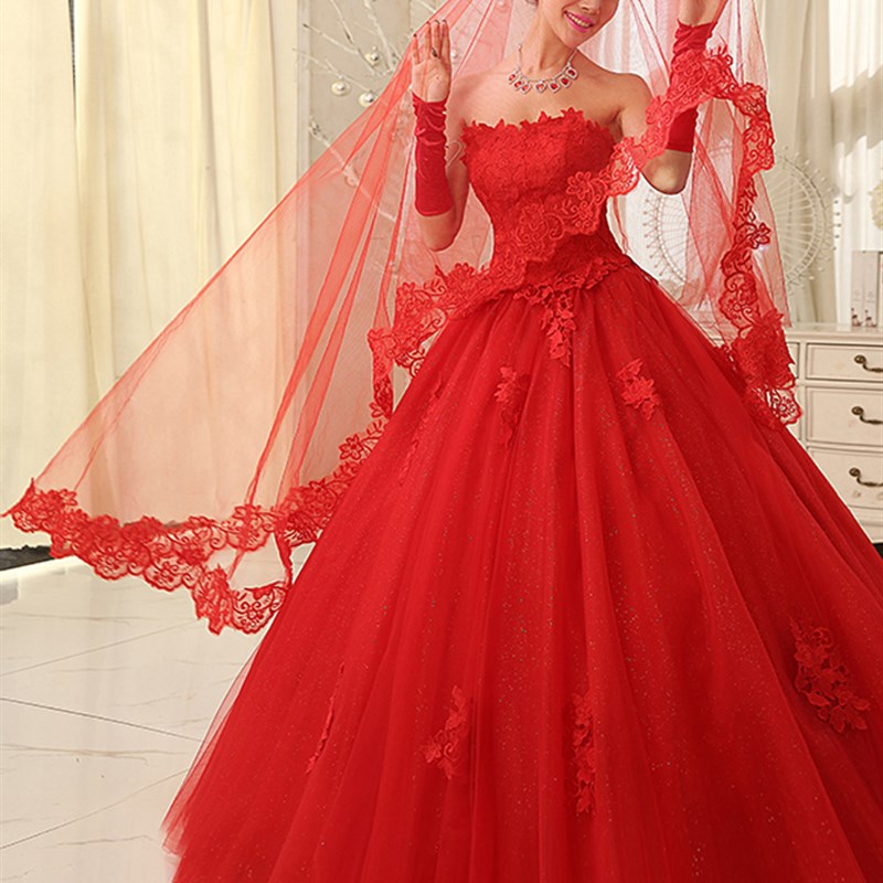 红色头纱新娘头纱 m3米电脑花边头纱长头纱蕾丝花边头纱拖尾头纱