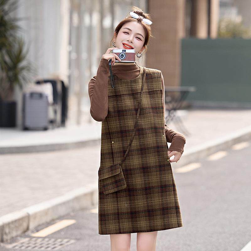 连衣裙秋冬2025新款长袖T恤加厚格子毛呢打底背心裙两件套NS9726