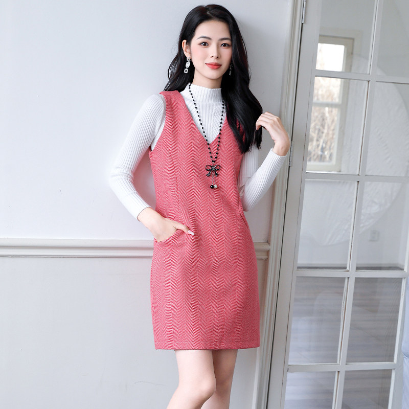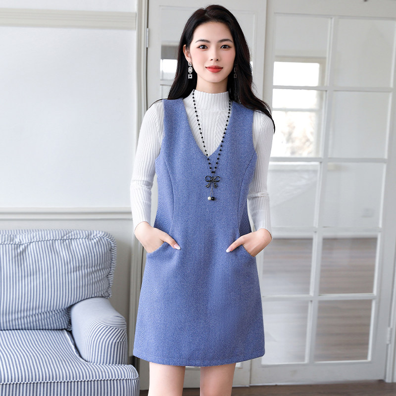 pusumede 雅致书卷 V领背心连衣裙女秋冬气质收腰毛呢中长款裙子