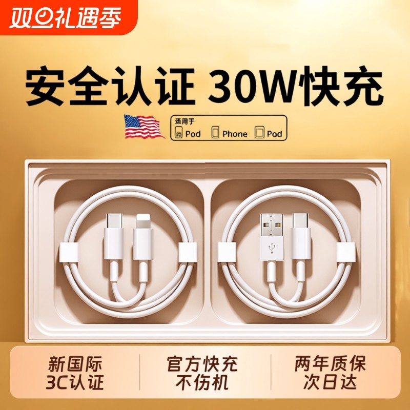 【30W快充】官方适用苹果充电线数据线14promaxiPhone13/1215/16PD手机11加长2米ipad正品7plus8冲电装6器pd