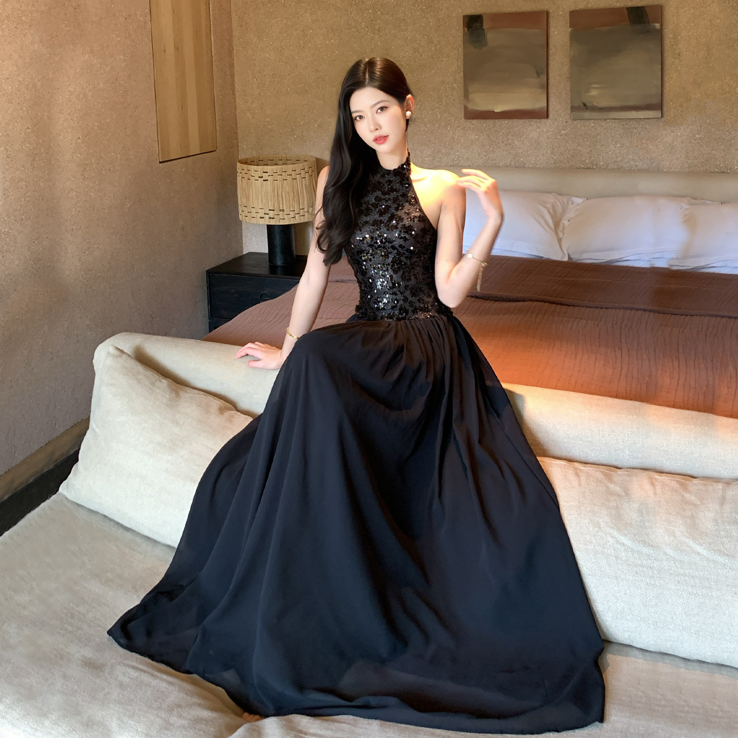 挂脖小晚礼服裙女生日宴会聚会短款亮片连衣裙气质高端轻奢主持人
