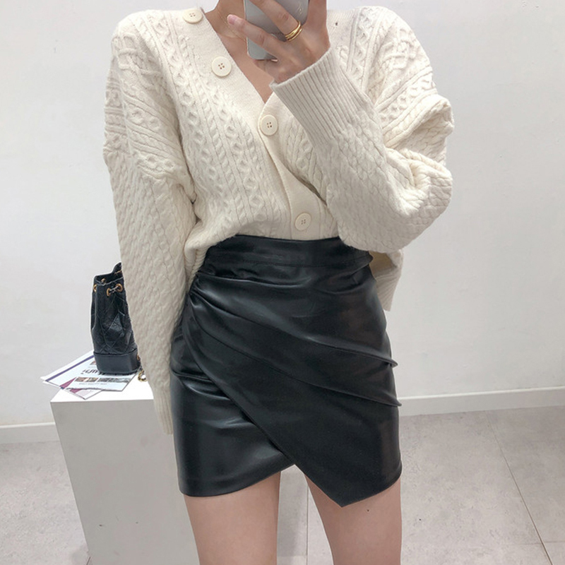 素芭解构式不规则皮裙女秋季复古摩登时尚休闲百搭半身裙SK0706