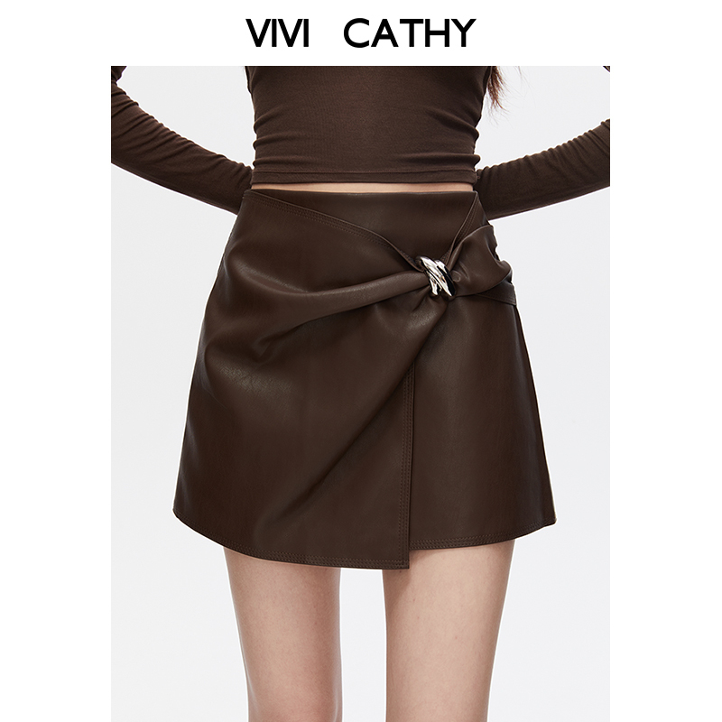 VIVICATHY2025秋韩系设计感不规则扭结皮裙女美拉德焦糖色a字裙