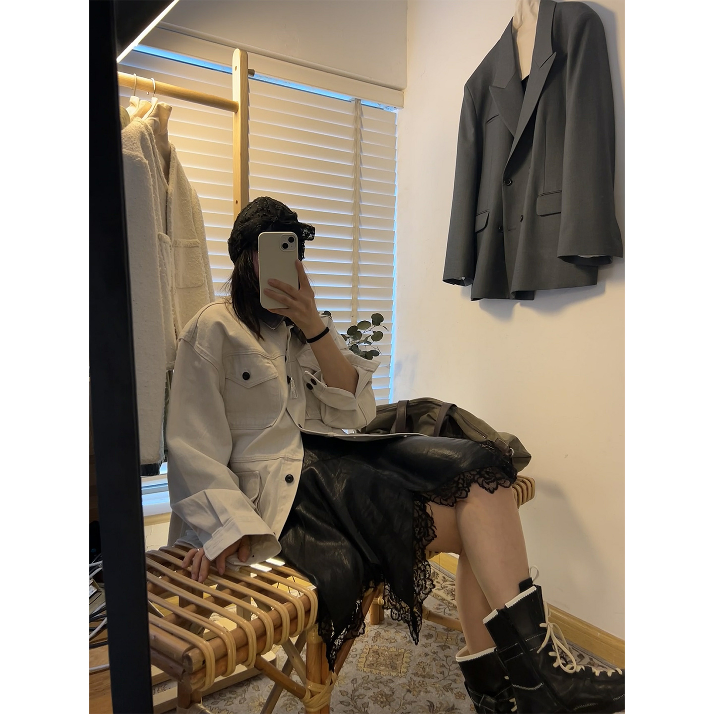 现货 正品韩代东大门秋冬 小众轻奢蕾丝拼接半身不规则皮裙短裙