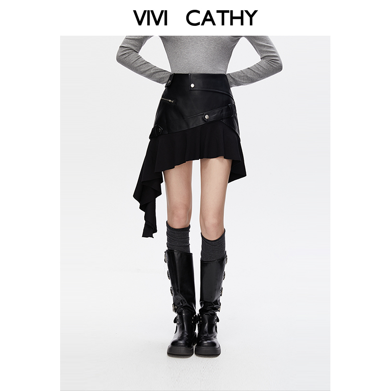 VIVICATHY2025秋不规则高级感皮裙女美拉德高腰荷叶边拼接半身裙