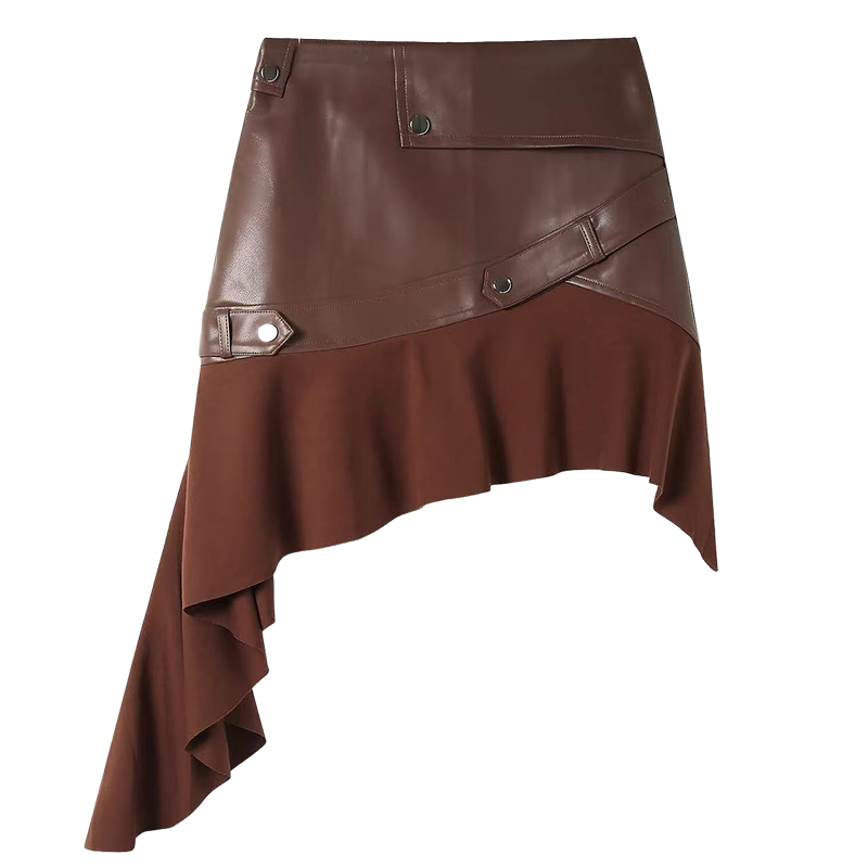 VIVICATHY2025秋复古咖色P不规则皮裙女拼接荷叶边辣妹包臀短裙