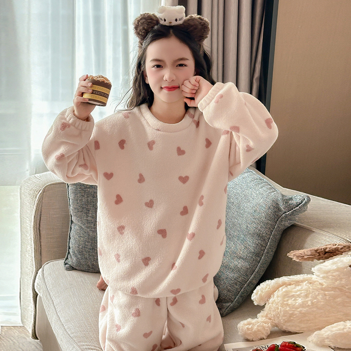 儿童冬季加厚珊瑚绒睡衣女童杨梅绒中大童小女孩圆领家居服套装新