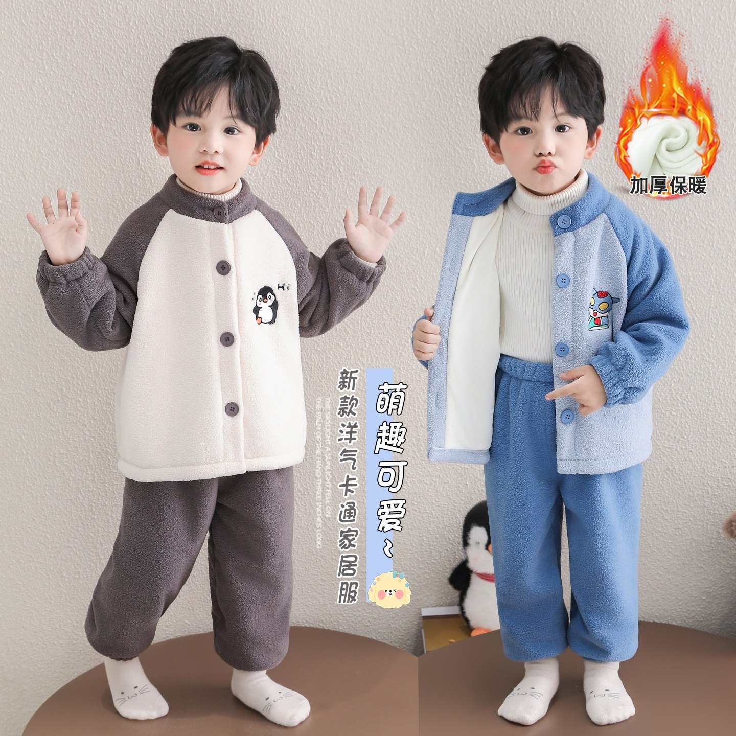 男童家居服秋冬季套装2025新款法兰绒杨梅绒睡衣长袖开衫男宝冬款