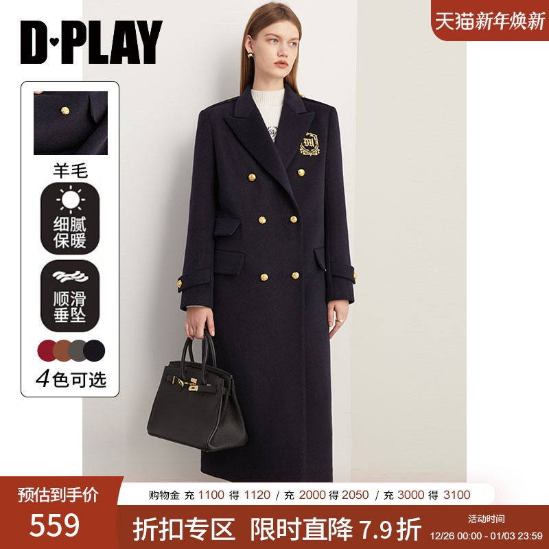 DPLAY年冬季气质学院风大衣藏青色刺绣羊毛呢西装外套呢子女
