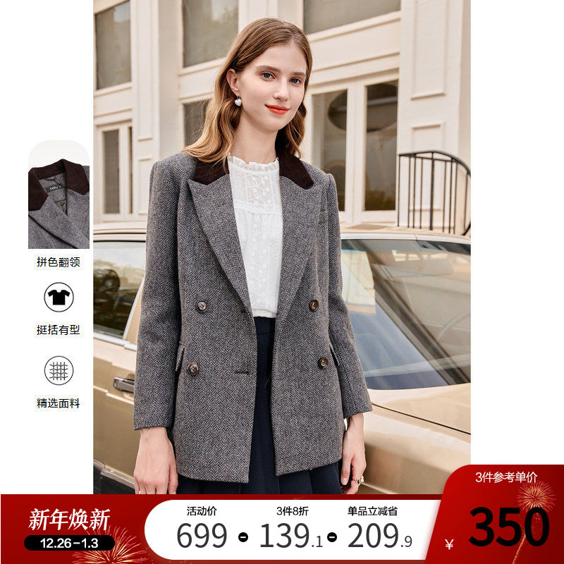 betu百图女装2024年春季新款通勤双排扣西装领毛呢外套呢子大衣